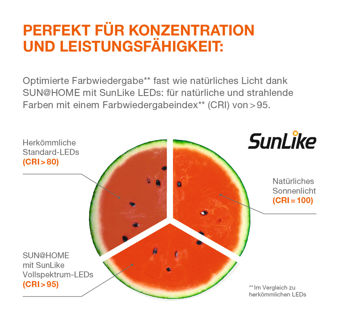 • Die innovativen SunLike Vollspektrum-LEDs der SUN@HOME-Produkte bieten ein breiteres Farbspektrum als herkömmliche LEDs: von gemütlichem Kaminlicht bis zu anregendem Tageslicht (2 200 – 5 000 Kelvin) und dabei mit natürlichen und strahlenden Farben mit einem Farbwiedergabeindex (CRI) von >95.